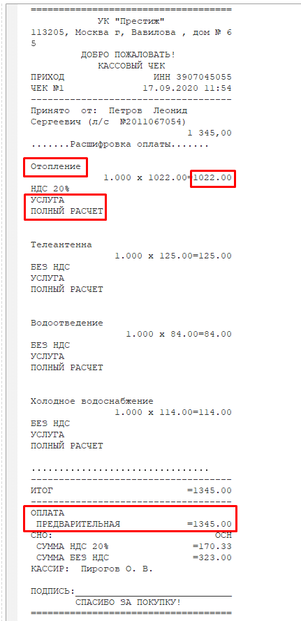 Печать чеков из документа «Зачет авансов по услугам ЖКХ»