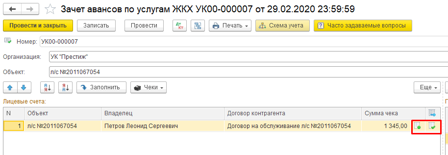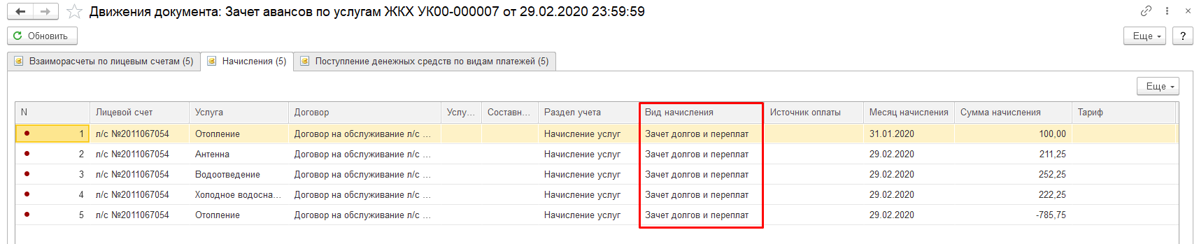 Работа с документом «Зачет авансов по услугам ЖКХ»