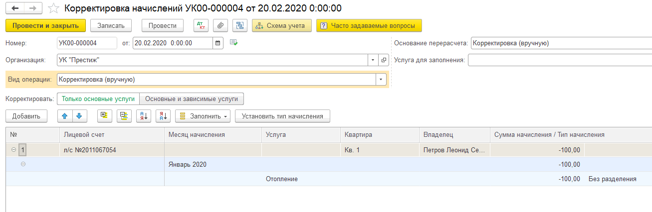 В феврале создадим корректировку начислений по услуге «Отопление» за январь: