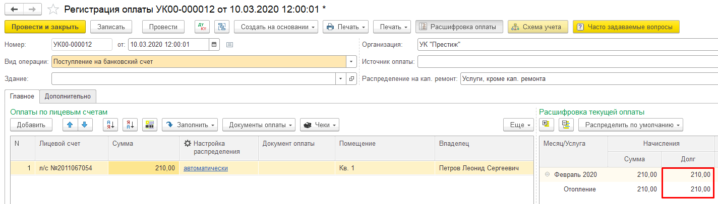 А долг по услуге «Отопление» составит 210 руб., что можно увидеть при отражении оплаты в марте: