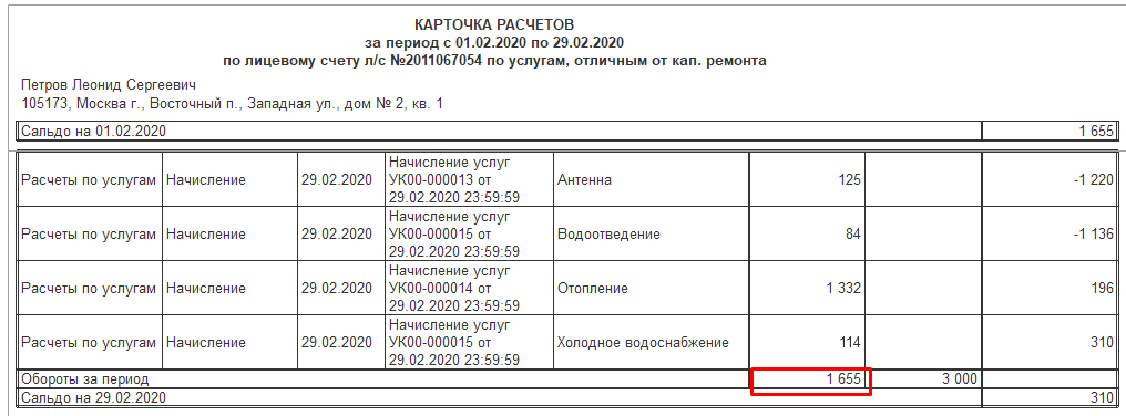 В нашем примере по лицевому счету л/с №2011067054 по услуге «Антенна» после оплаты в феврале образовался аванс в размере 336,25 руб. В конце месяца выполнено начисление на сумму 125 руб. Таким образом, начисление частично погасит аванс текущего месяца, и в документе в серых строках отражаются суммы, равные суммам начислений. Аналогично по услугам «Холодное водоснабжение» и «Водоотведение».