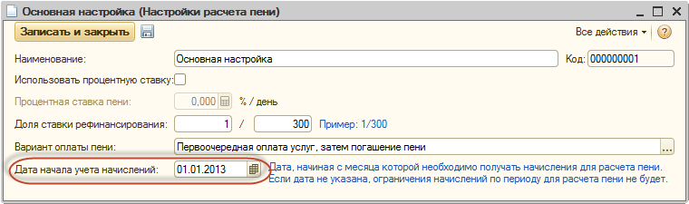 В поле «Дата начала учета начислений» указывается дата начала учета начислений, с которой необходимо получать начисления для расчета пени. Если дата не указана, ограничения начислений по периоду для расчета пени не будет: