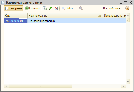 В справочнике «Настройки расчета пени» есть предопределенная настройка расчета: