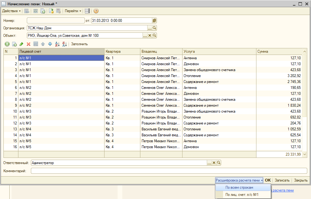 6. После начислений можно получить расшифровку расчета пени по всем строкам табличной части или по выделенному лицевому счету: