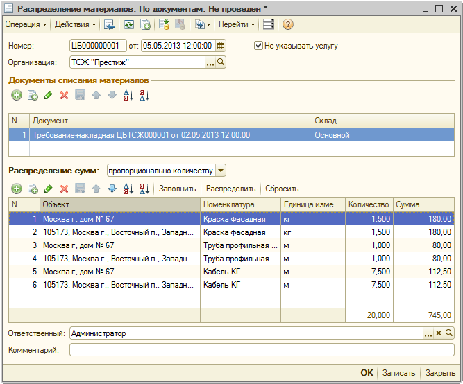 Для того чтобы произвести распределение материалов на основании типовых документов в подомовом учете в программе 1С: Учет в управляющих компаниях ЖКХ, ТСЖ и ЖСК, воспользуемся документом «Распределение материалов». Для этого выполним следующие действия: