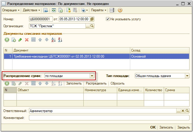 - Выберем вариант распределения затрат по домам в поле «Распределение сумм»: