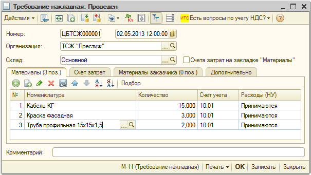 - Для передачи материалов в основное производство, на общепроизводственные или общехозяйственные расходы воспользуемся документов «Требование-накладная» (пункт меню «Производство – Требование-накладная»).