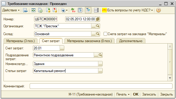 - На закладке «Счет затрат» укажем нужный счет затрат и остальные реквизиты: