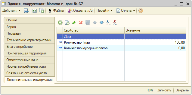 Характеристики «Количество Гкал» и «Количество мусорных баков» указываются в настройках здания во вкладке «Дополнительная информация»: