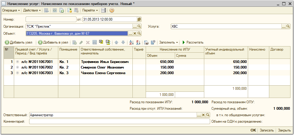 3) так как у счетчиков не установлен флажок «Используется в качестве «выходного» прибора учета», в начислениях будут учтены расходы всех счетчиков.