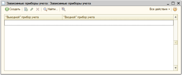4. Настроим зависимости счетчиков в регистре сведений «Зависимые приборы учета». Регистр можно открыть из списка счетчиков при выборе меню «Перейти – Зависимые приборы учета» или при помощи меню «Операции – Регистры сведений – Зависимые приборы учета»: