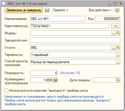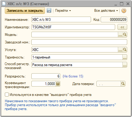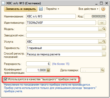 В данном примере все действия аналогичны действиям из примера №1, за исключением того, что для счетчика «ХВС л/с №3» установим флажок «Используется в качестве «выходного» прибора учета»:
