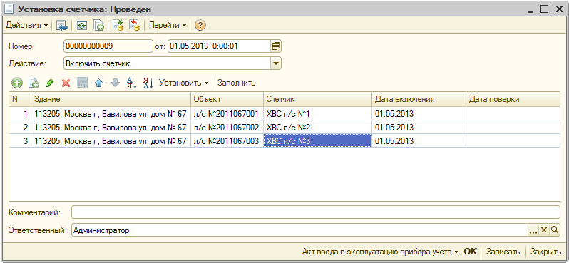 3. Установим счетчики на лицевые счета с помощью документа «Установка счетчика»:
