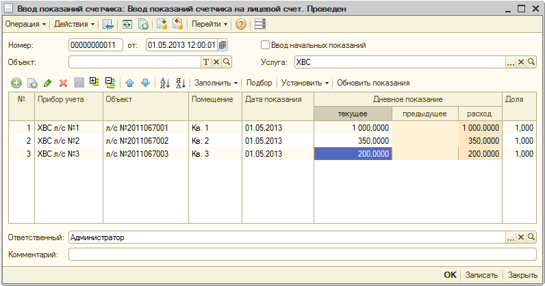 1) Введем показания счетчиков на лицевые счета: