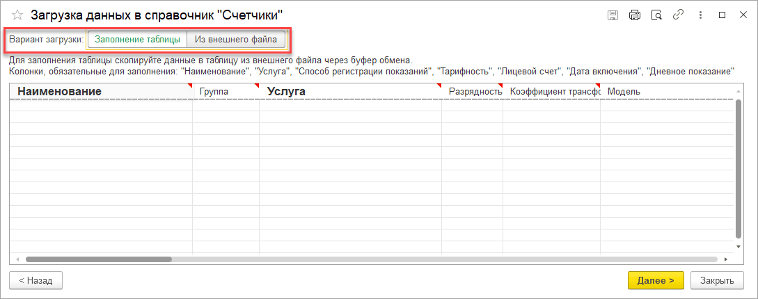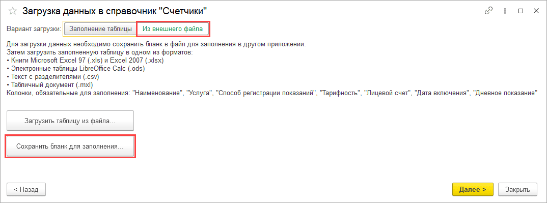 Шаг 1. Откройте обработку в «Приборы учета → Сервис → Загрузка данных из файла»: