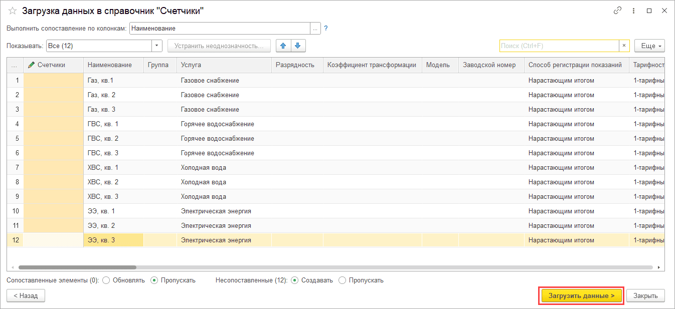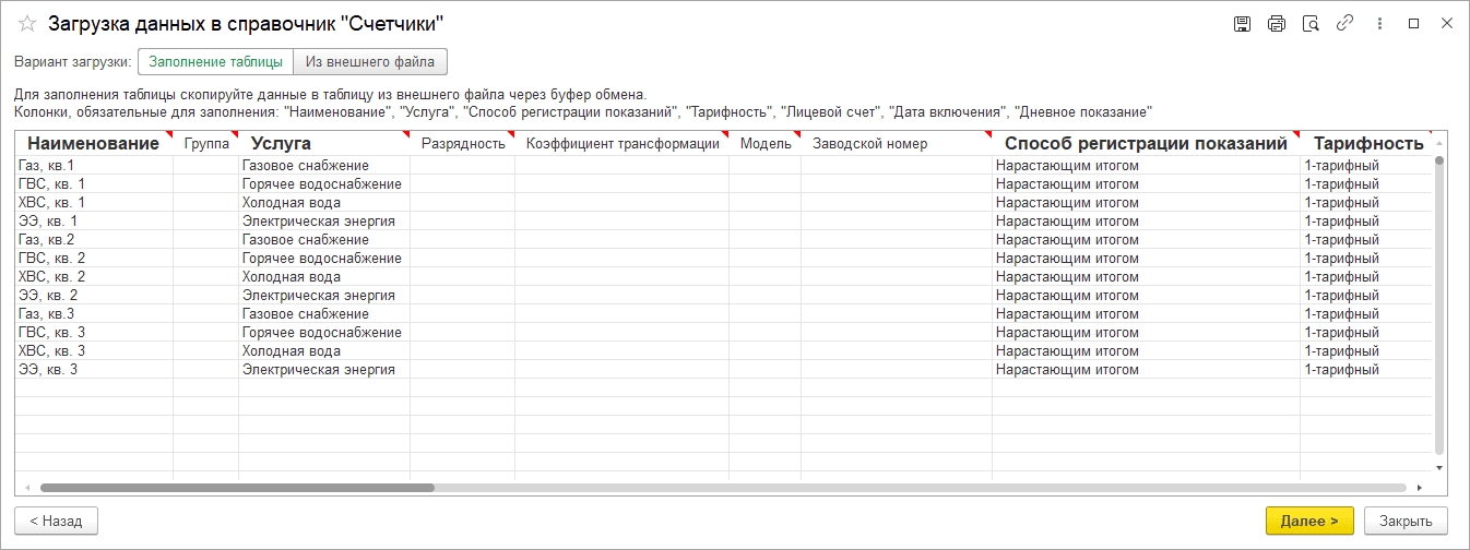 Таким образом, пользователь получает готовый набор сведений по счетчикам, который позволит удобно и корректно вести учет в программе и проводить начисления.