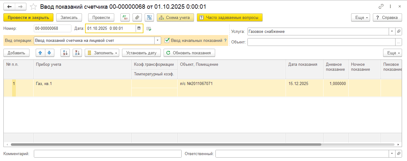 Если не заполнить поле «Дата документа», то «Установка счетчика» и «Ввод показаний счетчика» будут проведены текущей датой.