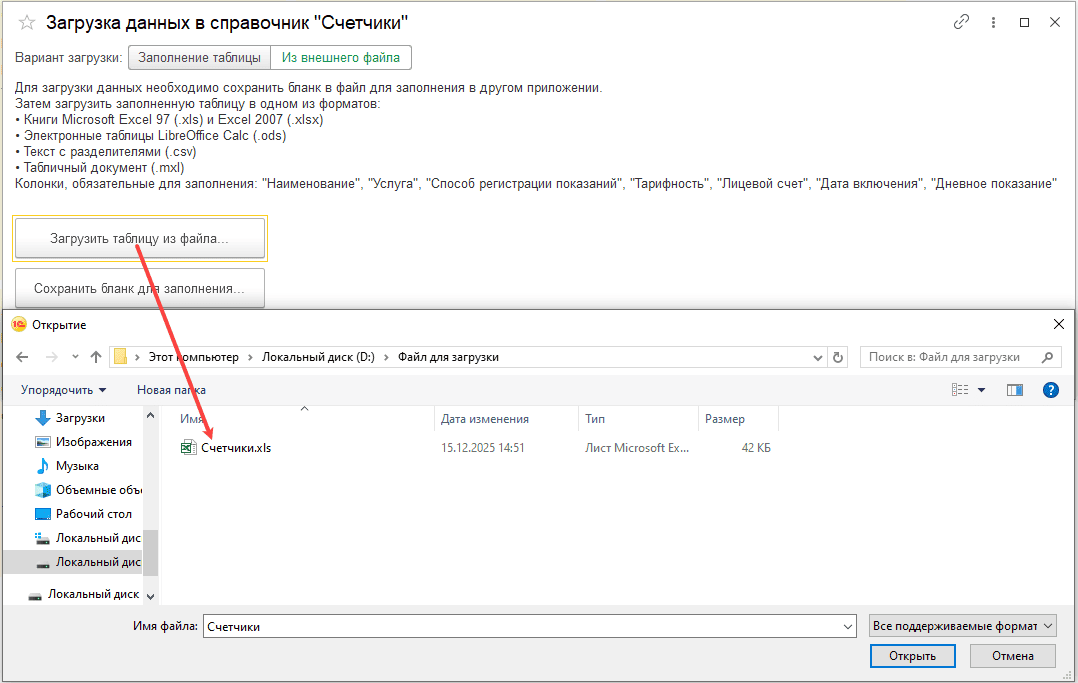 Она помогает автоматически загрузить сведения о счетчиках и установить их из табличного документа, например, из файла Excel. Загрузка счетчиков из файла в 1С:Учет в ЖКХ необходима для того, чтобы пользователи могли быстро перенести данные и начать работу в программе без ручного ввода.