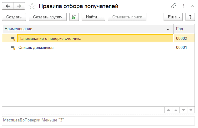 Шаг 1. Перейдите в меню «Отправка уведомлений → Правила отбора получателей». В программе есть готовые правила для отбора должников и для отбора лицевых счетов, у которых наступает дата поверки счетчиков:
