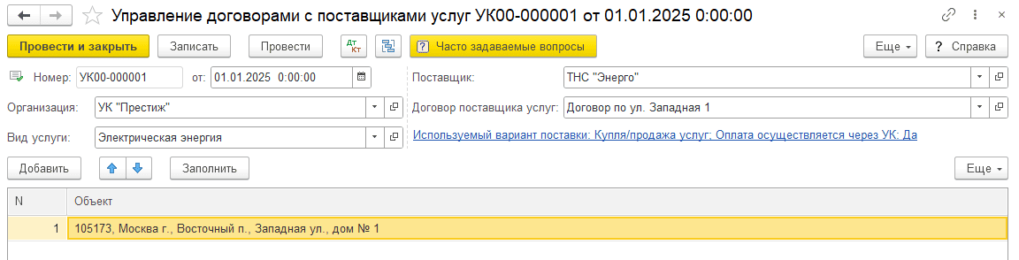 Предположим, что поставщиком услуги Электрическая энергия в 2025 году был ТНС «Энерго», создан соответствующий договор с поставщиком услуг: