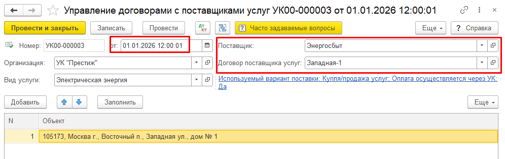 С 1 января 2026 года поставщиком услуг становится Энергосбыт. Создадим новый документ «Управление договорами с поставщиками услуг»: