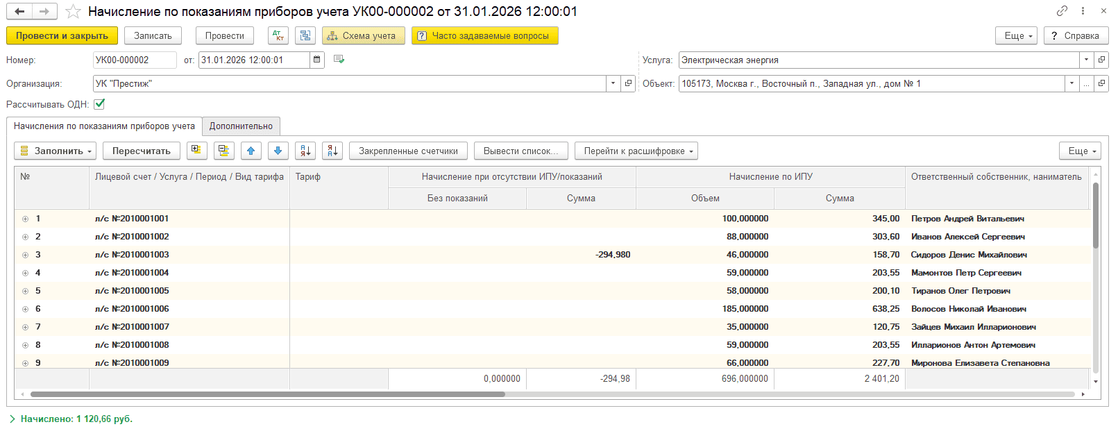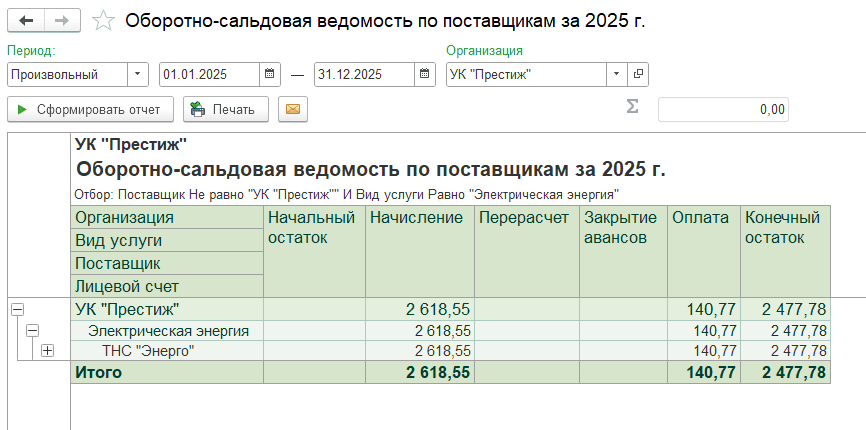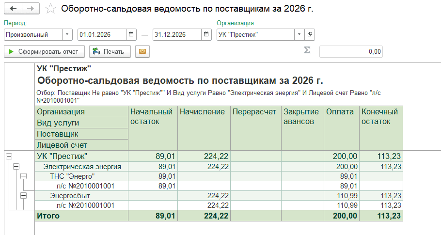 В результате после смены поставщика коммунального ресурса начисления за предыдущие периоды сохраняются за прежним поставщиком, новые начисления отражаются по новому поставщику, а распределение оплат между поставщиками можно проверить в отчете «Оборотно-сальдовая ведомость по поставщикам».