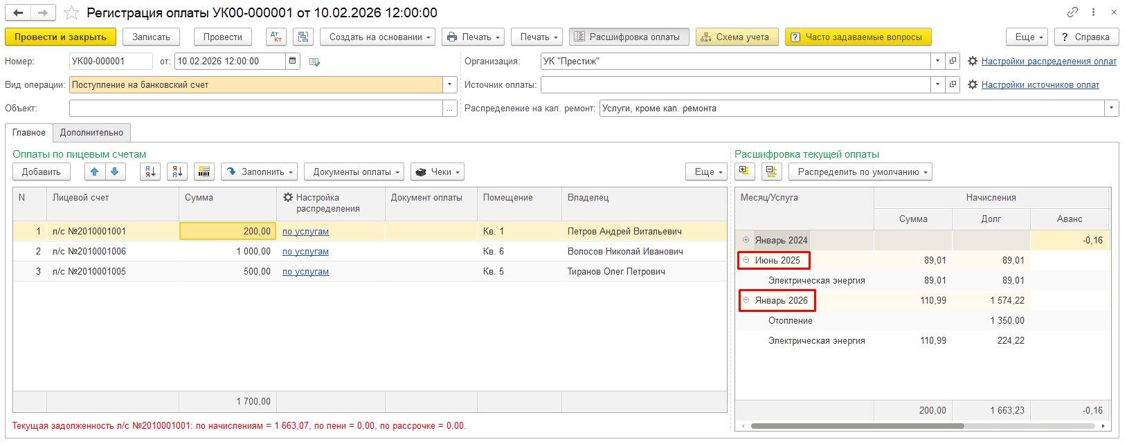 Отразим оплату в феврале 2026, при этом сумма распределяется и на начисления 2025 года при наличии долга и на начисление января: