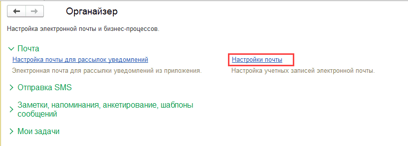 Нажмем на ссылку «Настройка почты для рассылок уведомлений» в разделе «Почта»: