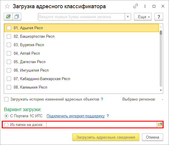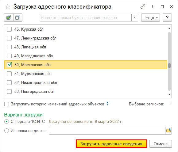 После выбора варианта загрузки выбираем регион и нажимаем «Загрузить адресные сведения».