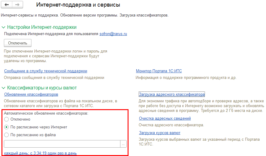 Зайдем в меню «Администрирование – Настройки программы – Интернет-поддержка и сервисы» и в разделе «Классификаторы и курсы валют» перейдем по ссылке «Загрузка адресного классификатора»: