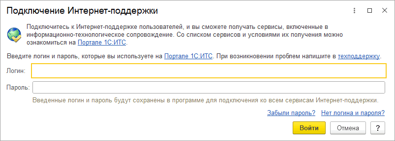 Загрузку можно выполнить сразу с сайта 1С:ИТС, в этом случае вводим данные для интернет-поддержки по ссылке «Подключить интернет-поддержку».
