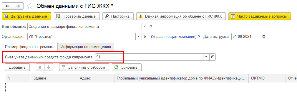 На вкладке «Размер фонда кап. ремонта» укажите здание/здания, по которым производится выгрузка: