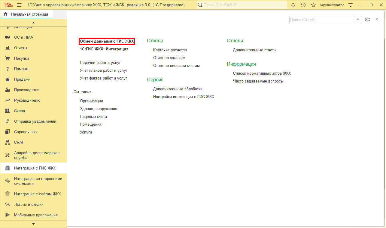 Шаг 2. Перейдите в меню «Интеграция с ГИС ЖКХ» и откройте форму «Обмен данными с ГИС ЖКХ»: