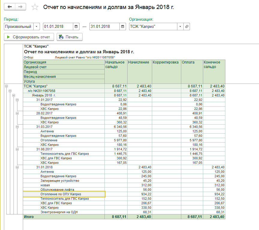 Для этого сформируем «Отчет по начислениям и долгам» по лицевому счету: