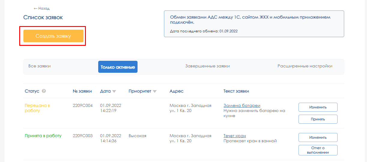 Диспетчер может самостоятельно оформить заявку на сайте, например, когда жилец сообщил о проблеме по телефону. Для этого нужно нажать на кнопку «Создать заявку»: