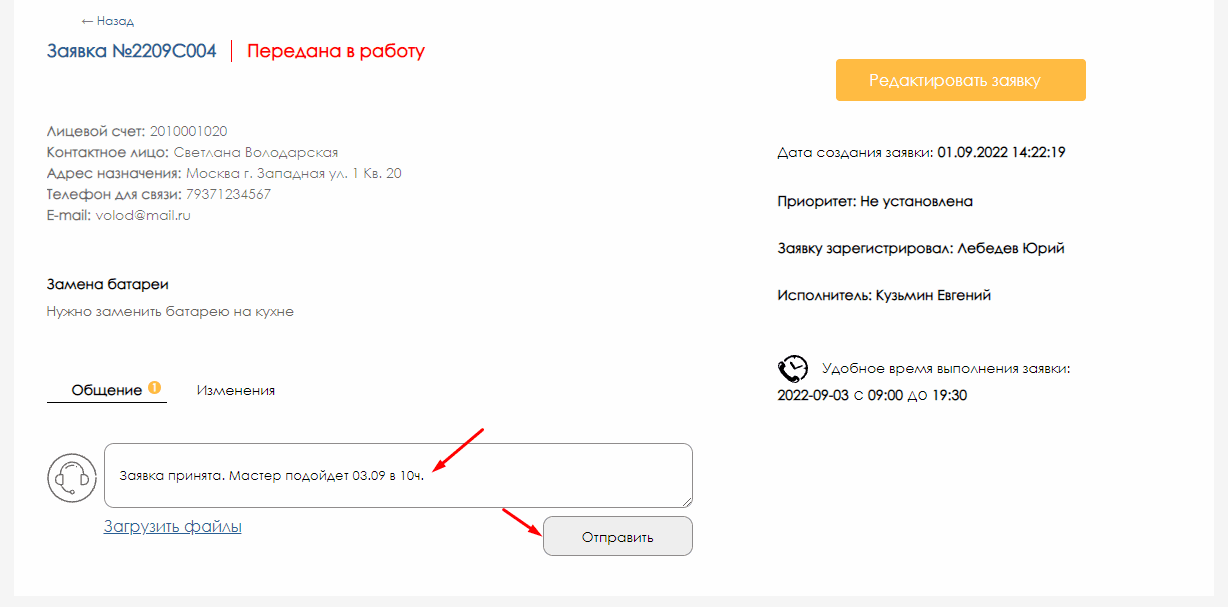 Здесь можно изменить номер телефона и E-mail для связи, указать приоритет выполнения заявки и поменять ответственного.