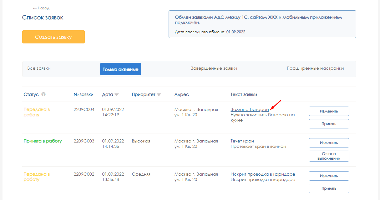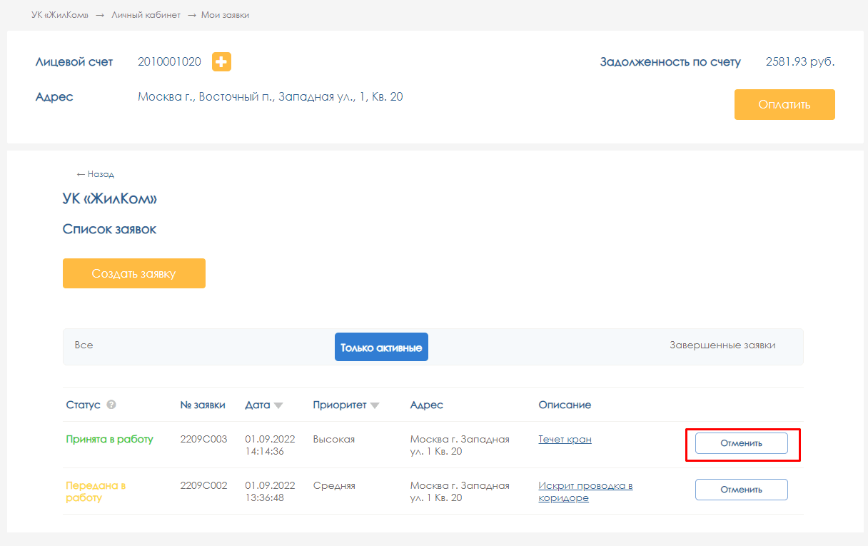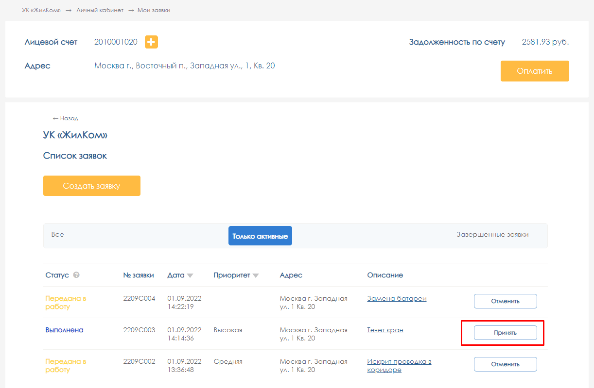 Работа с заявками в личном кабинете жильца