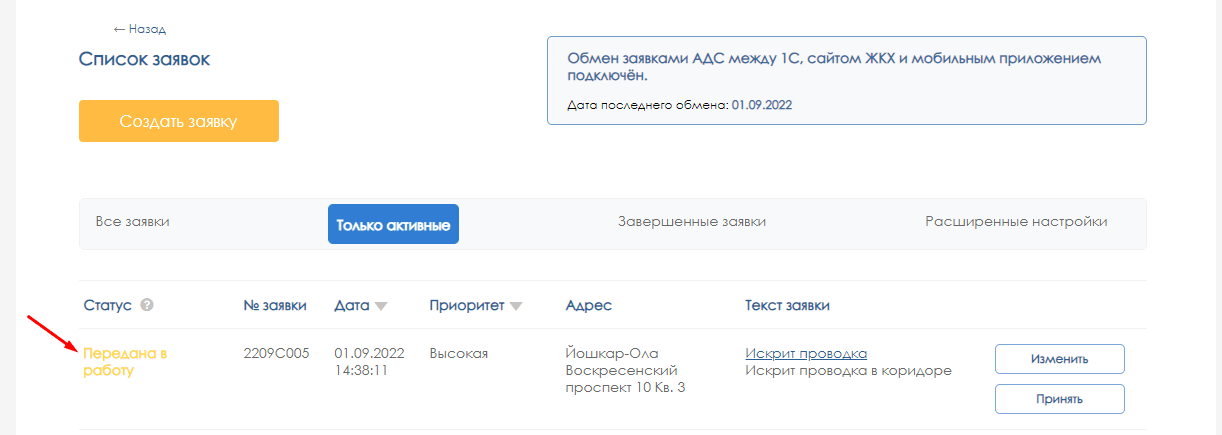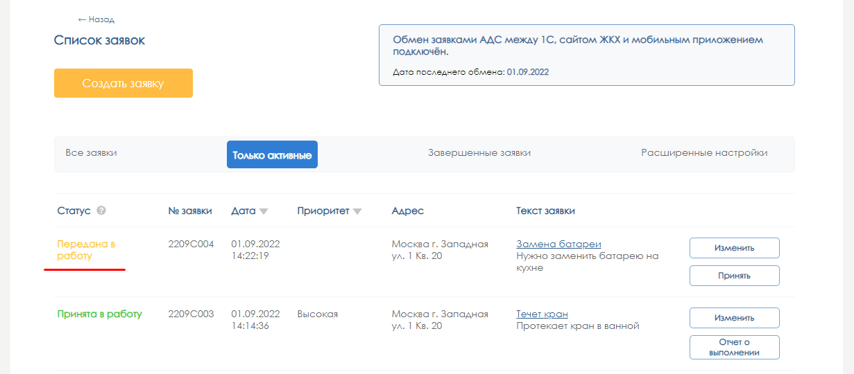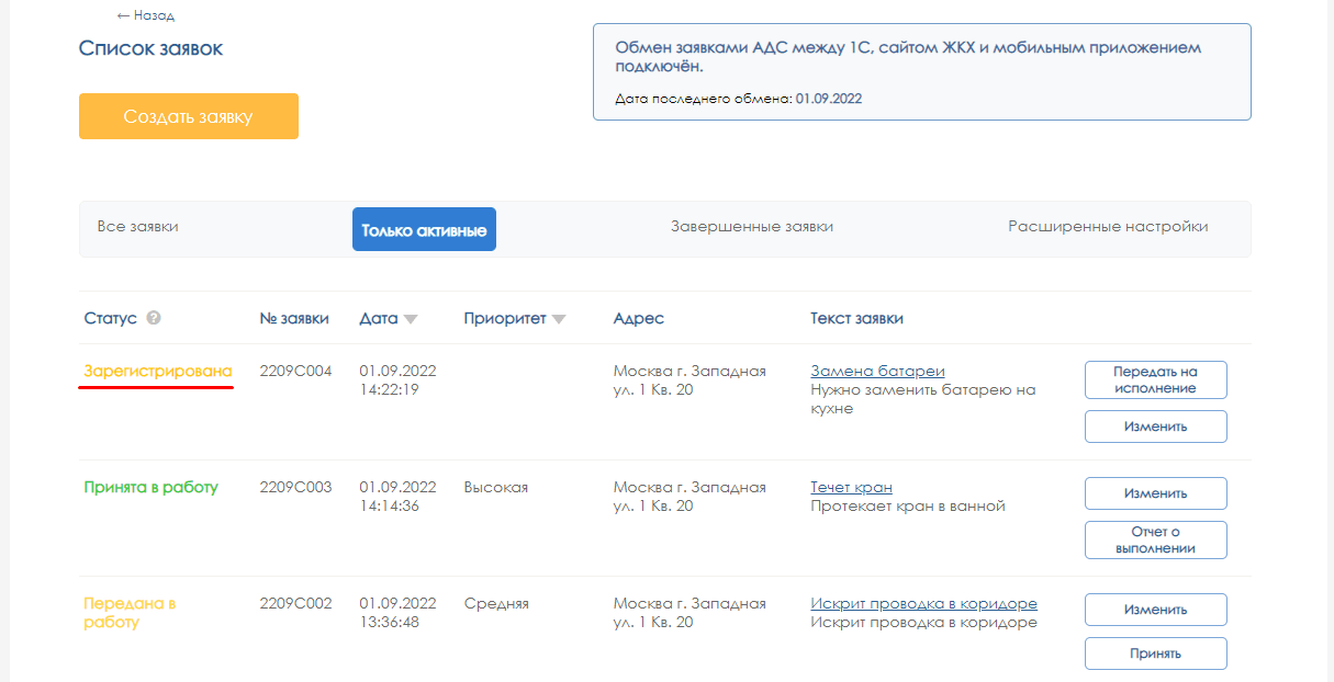 Созданная заявка отображается в личном кабинете жильца со статусом «Зарегистрирована», а если сразу назначен исполнитель – со статусом «Передана в работу»: