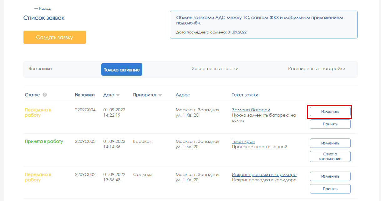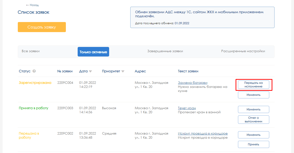 Рассмотрим работу с заявками под пользователем с правами диспетчера АДС.