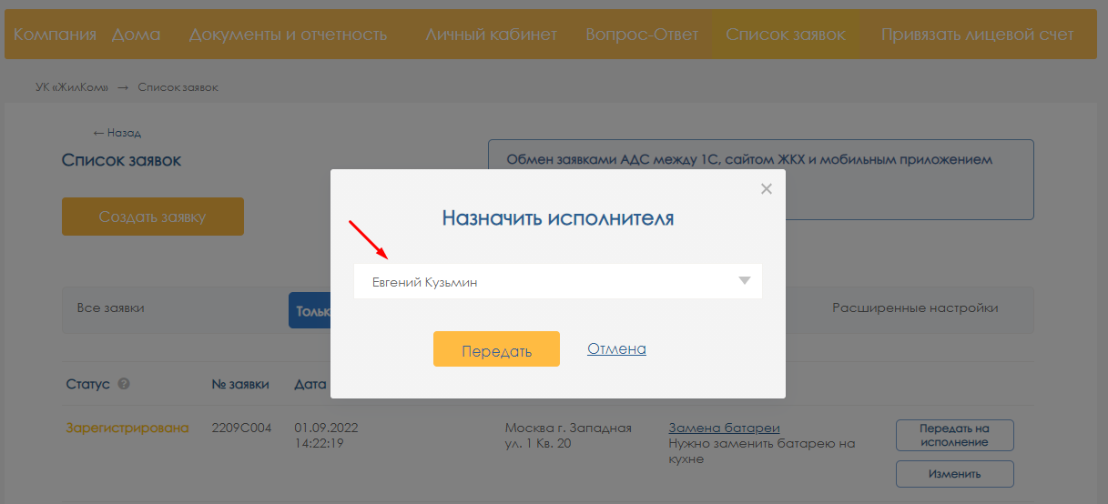 В открывшемся окне выбираем из списка ответственного за выполнение заявки (например, подрядную организацию/мастера или самого диспетчера) и нажимаем кнопку «Передать»: