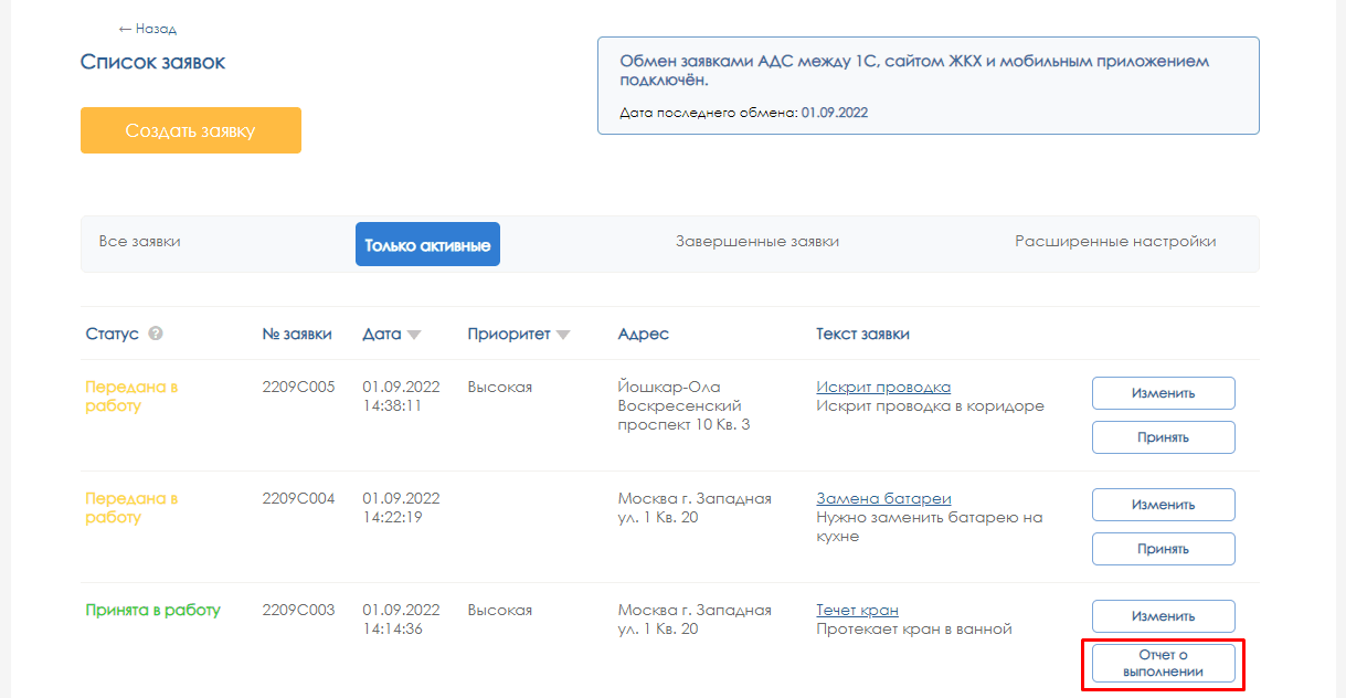 Выполнена – присваивается, когда ответственный за выполнение (Диспетчер или Подрядная организация) нажимает на кнопку «Отчет о выполнении»: