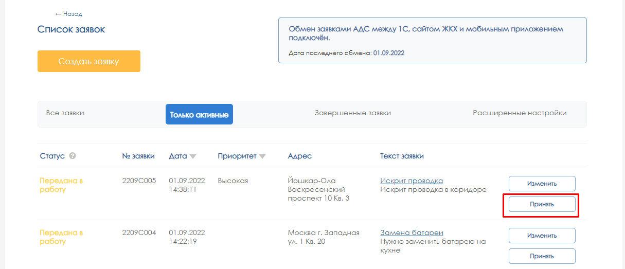 Поступившей заявке присваивается статус «Новая заявка». Чтобы принять заявку и передать ее в работу, нажимаем на кнопку «Принять»: