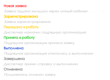 Новая заявка – присваивается при подаче заявки жильцом через личный кабинет;