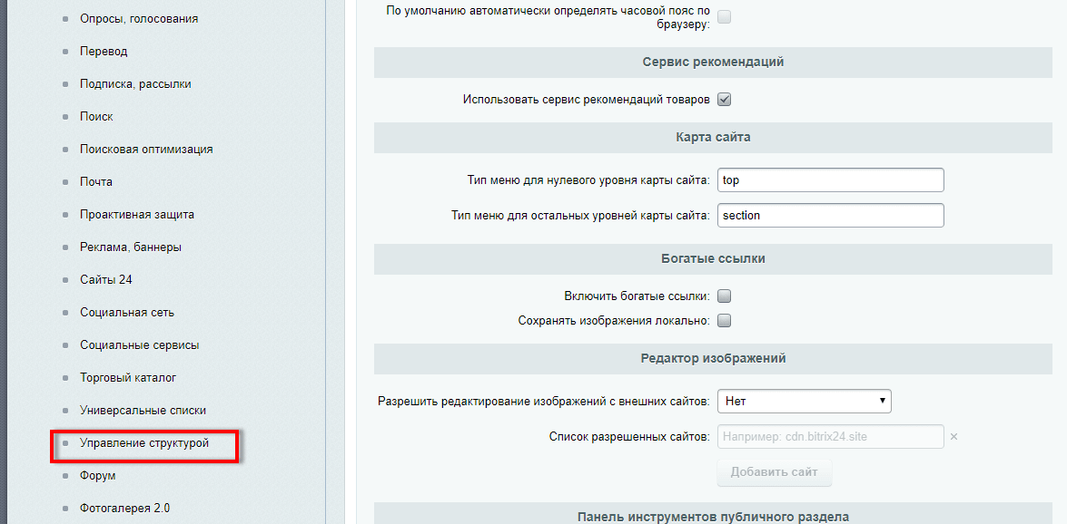 Зайти на ваш сайт в административный раздел в меню «Настройки – Настройки модулей – Управление структурой»: