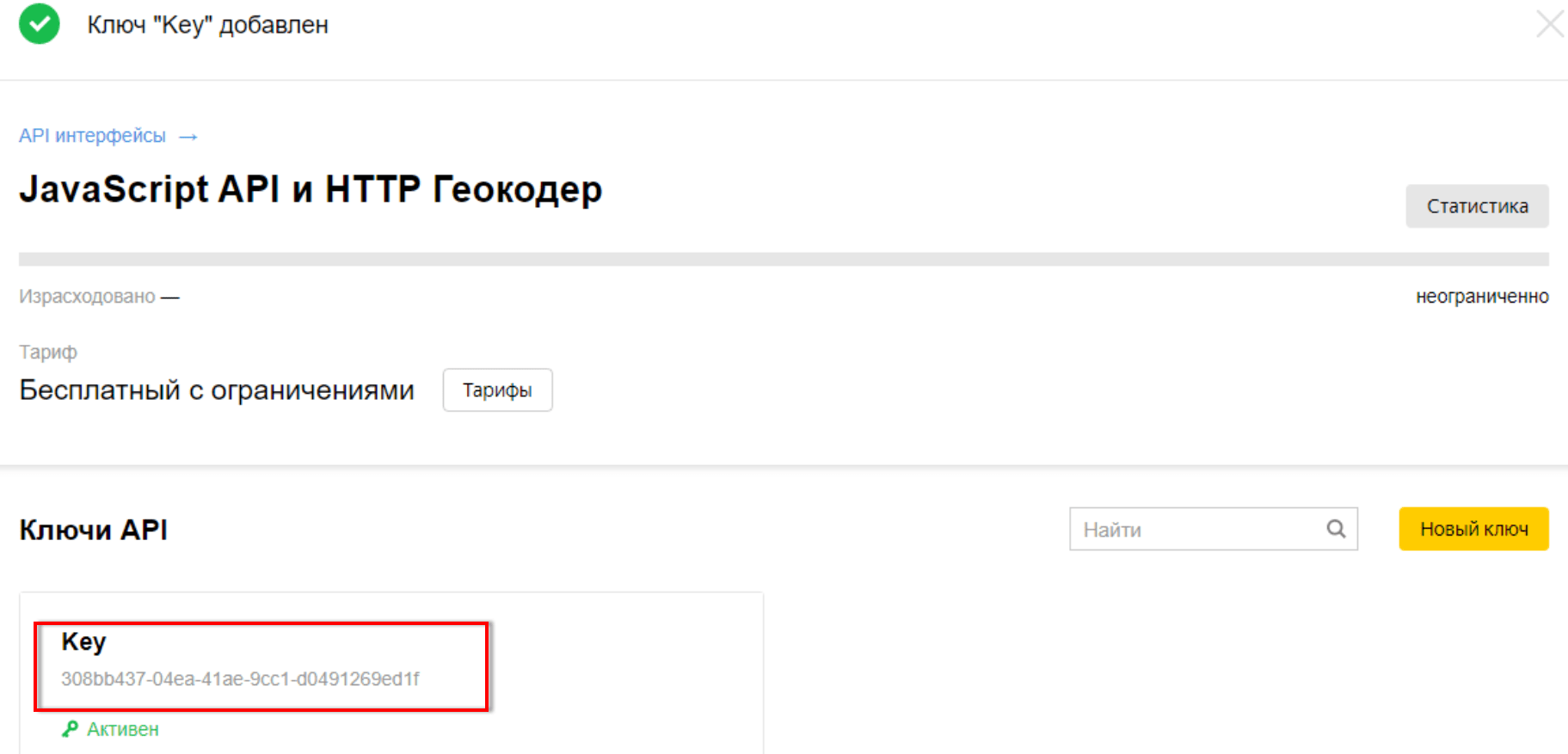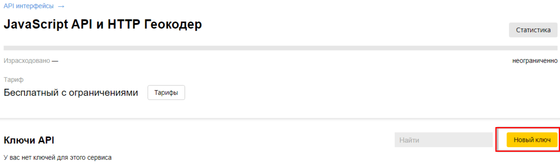 После этого будет добавлен API интерфейс, здесь нужно нажать на область ниже надписи «JavaScript API и HTTP Геокодер»: