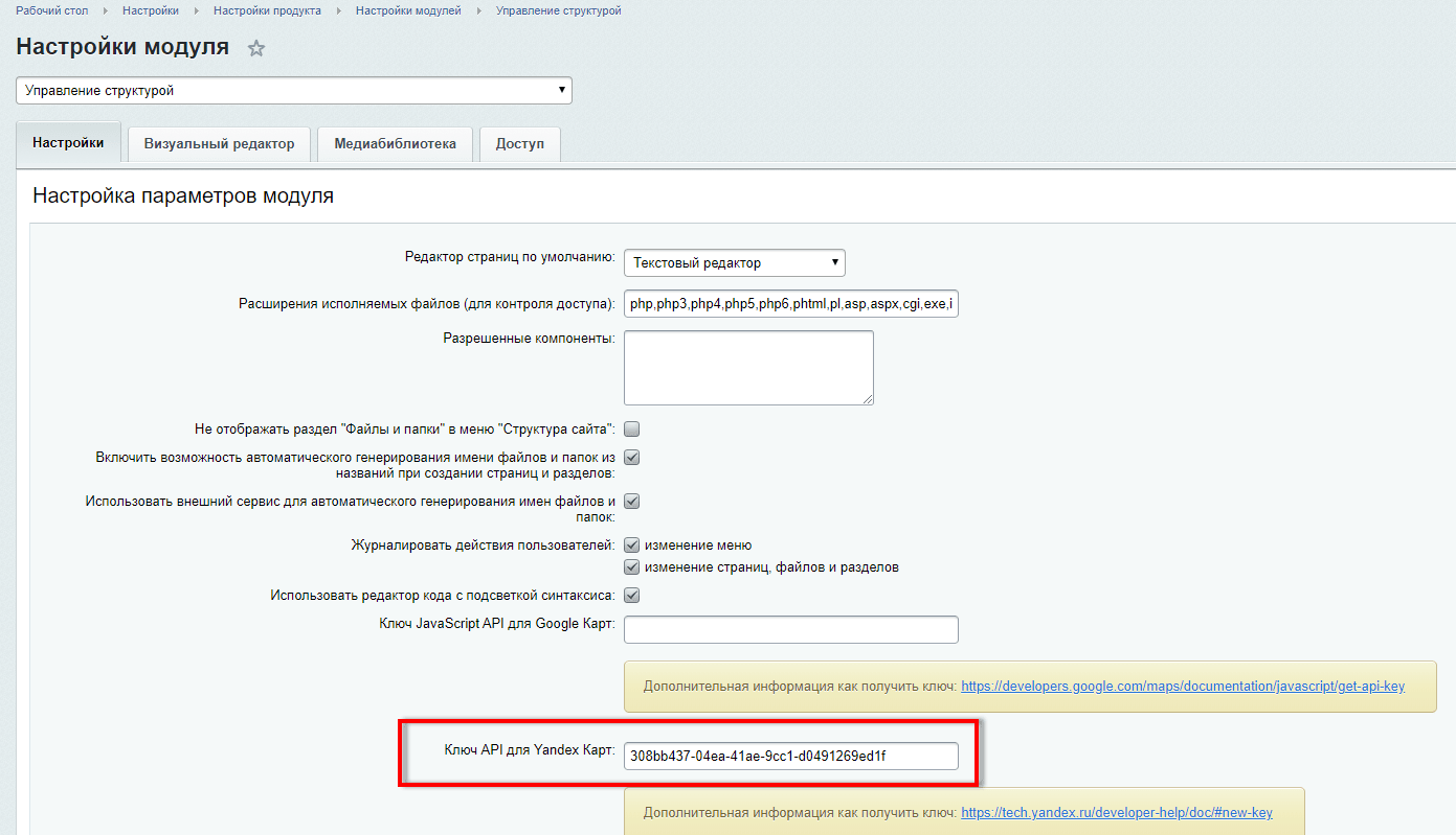 Вставить API ключ в поле «Ключ API для Yandex Карт»: