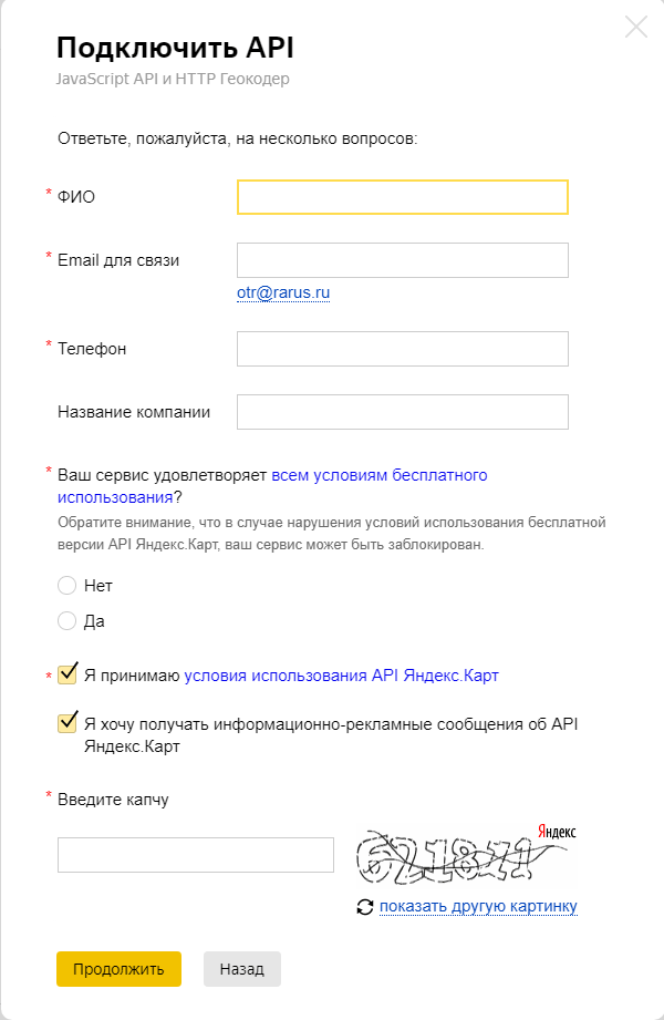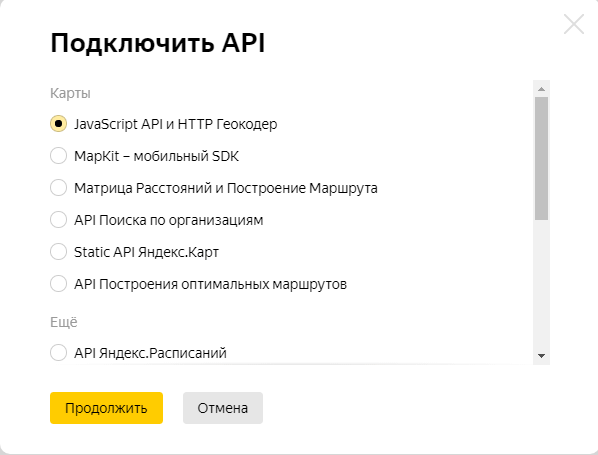 Выбрать пункт «JavaScript API и HTTP Геокодер» и нажать «Продолжить»: