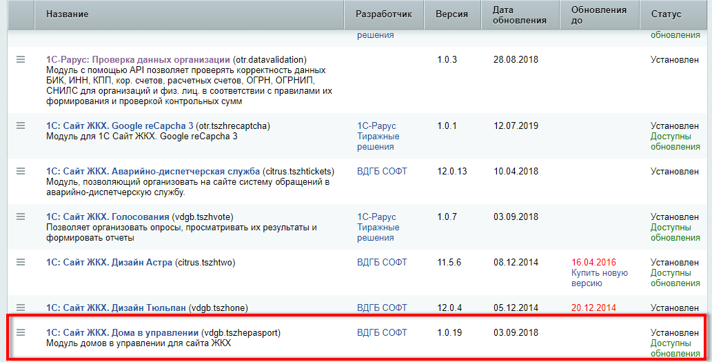 Модуль: 1С:Сайт ЖКХ. Дома в обслуживании должен быть версии не ниже 1.0.21. Проверить версию можно в административном разделе сайта в меню «Marketplace – Установленные решения»: