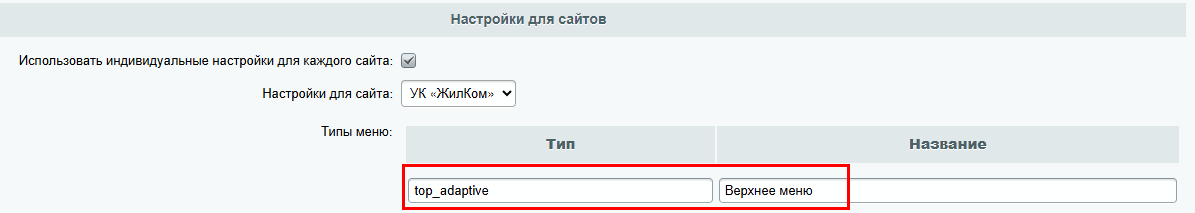 На закладке «Настройки» в разделе «Настройки для сайтов» добавьте тип меню «top_adaptive»: