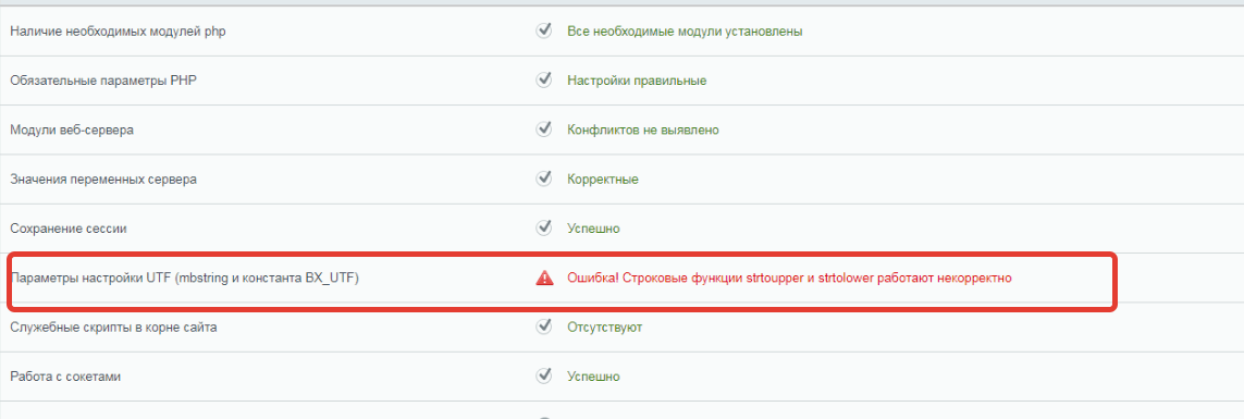 В 1С: Сайт ЖКХ при полной проверке может выйти ошибка «Параметры настройки UTF (mbstring и константа BX_UTF): Ошибка! Строковые функции strtoupper и strtolower работают некорректно»: